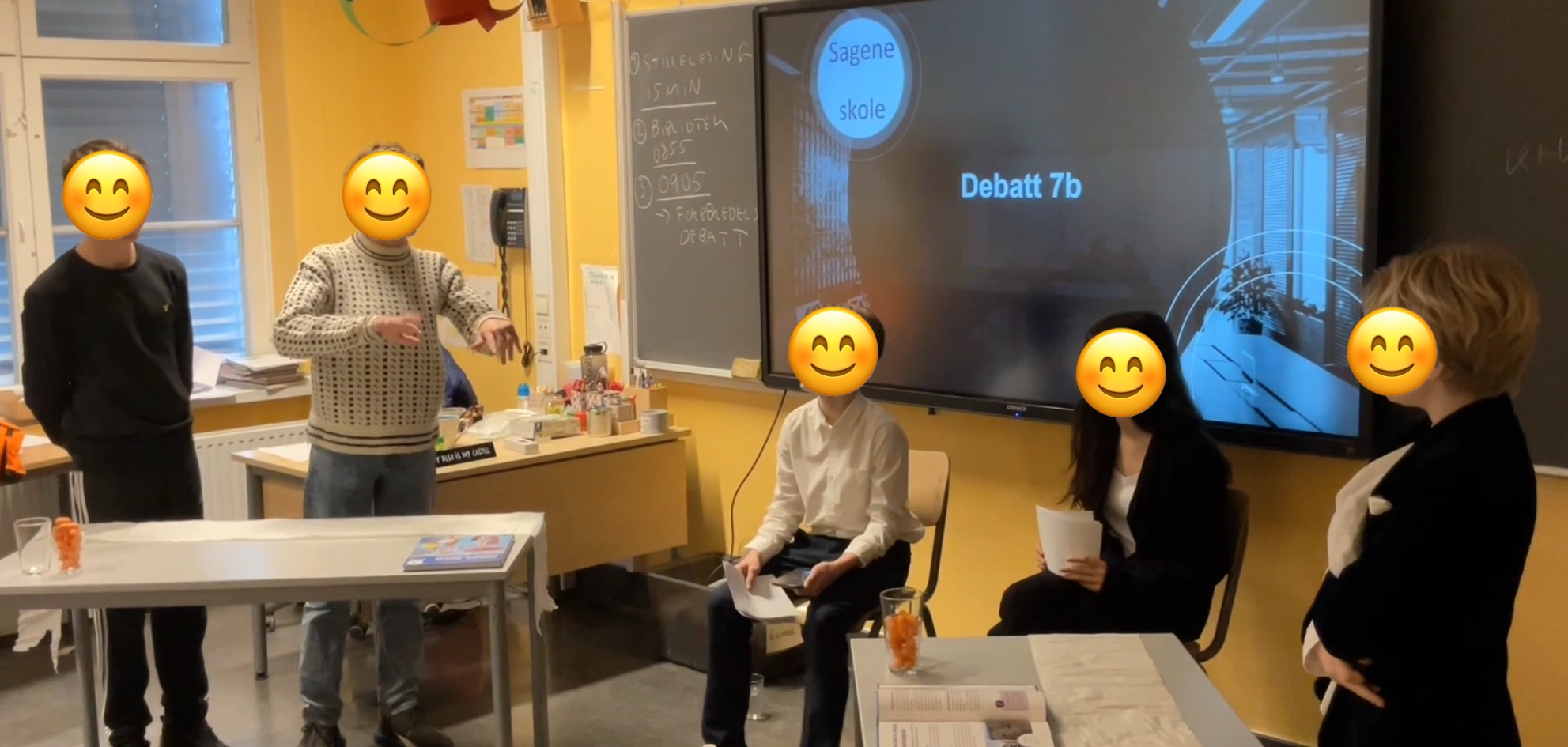 I forbindelse med «Bærekraftsuka» på Sagene skole i forrige uke arrangerte 7. trinn debatt omkring en rekke interessante temaer som ofte er oppe i media når de voksne diskuterer spørsmål knyttet til miljø- og natur. Elevene brukte første del av uken på å lære litt om hva slags regler som gjelder i en ekte debatt, blant annet hva som er forskjellen på innlegg og replikk og at det er debattleder som bestemmer hvem som til enhver tid skal få ordet.