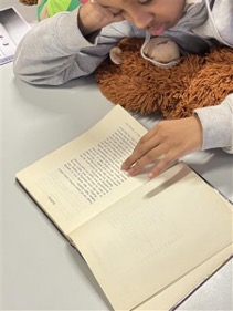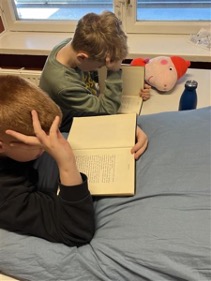 På 6. trinn har vi klasselesekurs der vi leser en felles bok og jobber med oppgaver sammen. Til lesestundene kan elevene ha med en pute eller en bamse hjemmefra. Koselig stemning i klasserommet!